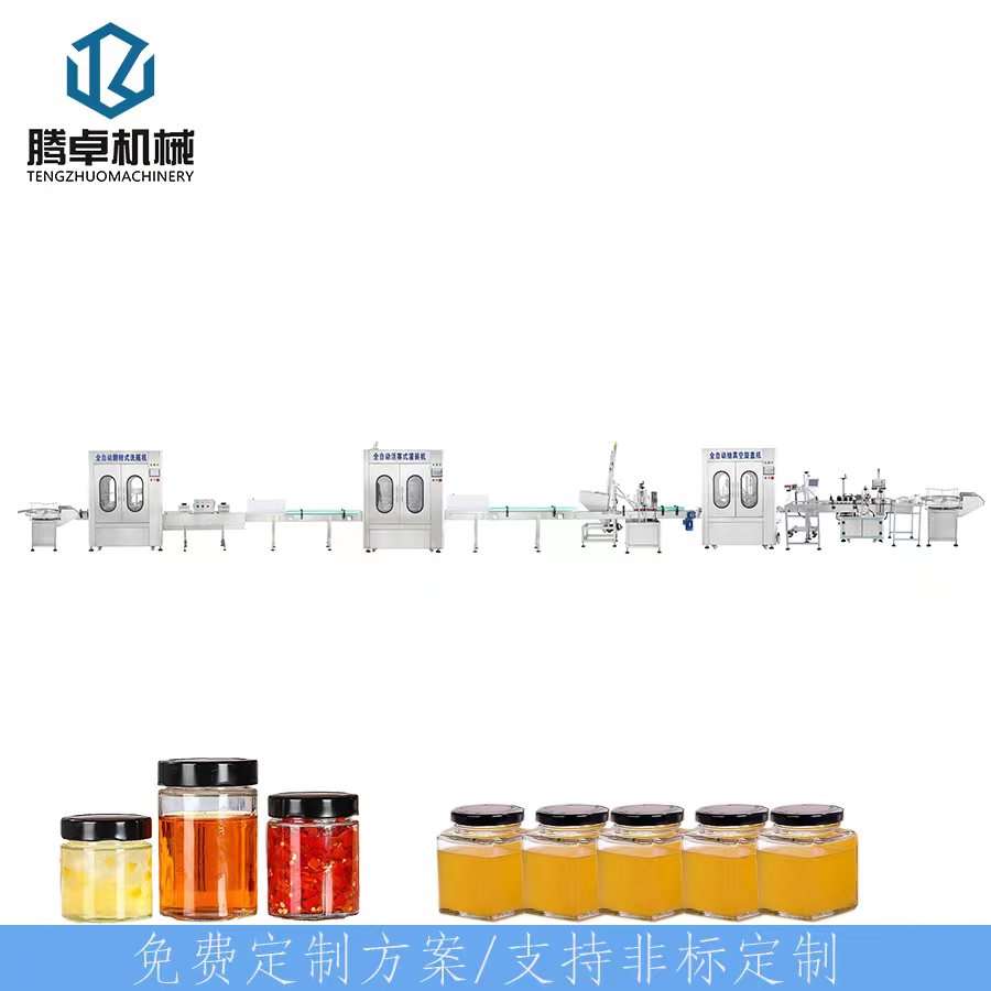 此生產(chǎn)線還適合用于醬料,辣椒醬,果汁飲料,酒類等食品的包裝。